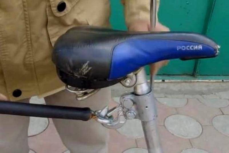 Более того, в данном примере предусмотрена страховка на случай разъединения фаркопа во время движения. Она выполнена из велосипедного тросика с карабином, который цепляется за раму велосипеда.