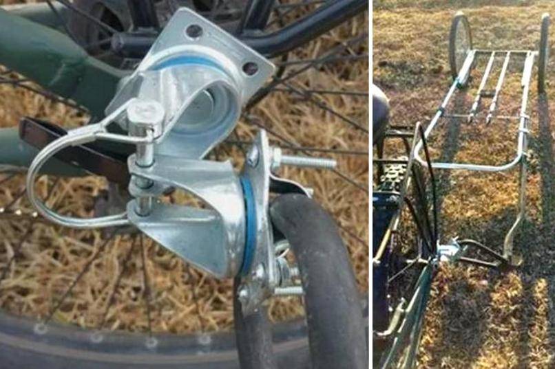 Для преобразования в такой трицикл подойдёт практически любой велосипед. У донора срезается передний треугольник, а к подседельной трубе с перьями приваривается труба с рулевым стаканом в конце. К рулевой колонке прикрепляется грузовая платформа с колёсами, а П-образная труба на ней служит для управления получившимся транспортным средством.
