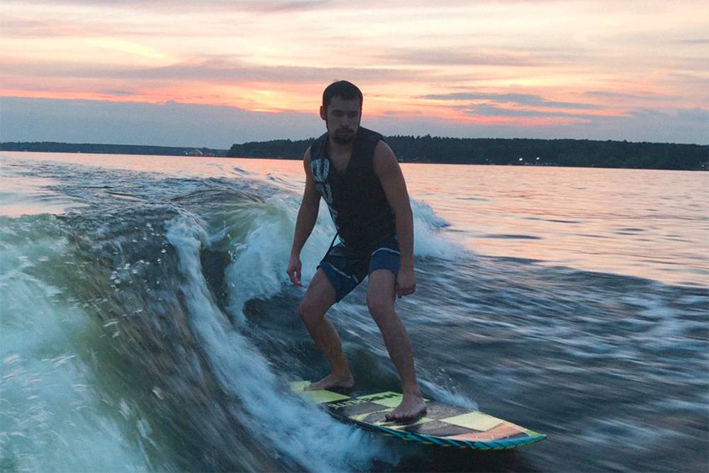 Вейксерфинг — это разновидность классического серфинга, который показывают в фильмах. Здесь тоже есть доска, на которую надо встать и попытаться поймать волну. Только волну создает не океан, а катер, который едет прямо перед вами. Подобраться к волне нужно с помощью фала — троса, который прикреплен к катеру. После вы отбрасываете фал и свободно балансируете на волне.