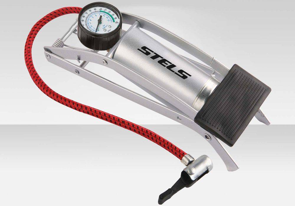 Для работы с этим типом необходима работа не только рук, но и ног. Вы упираете этот агрегат в землю, наступая ногами на специальные плоские пластины, а руками выполняете движения вверх и вниз. Достоинством такого типа инструмента является то, что он невероятно удобен. Так как вы упираете его в землю ногами, он имеет довольно хорошую устойчивость, а возможность двигать поршень двумя руками придаёт накачиванию колёс дополнительное удобство. Иногда рядом с пластинами для ног устанавливается специальный индикатор давления.