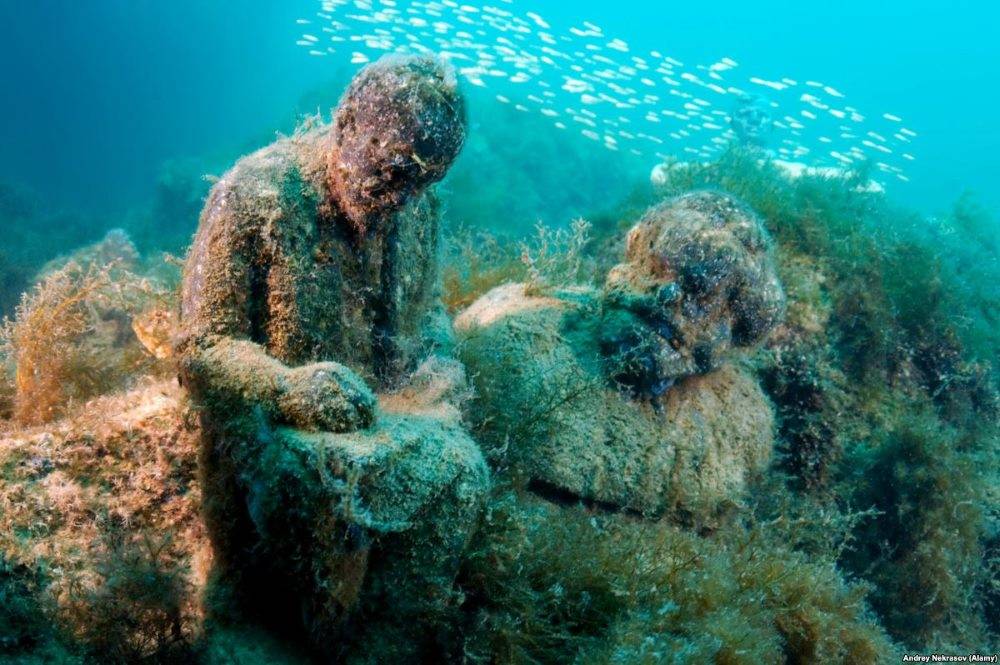 Гордость Тарханкутского полуострова – подводный музей «Аллея вождей». Благодаря снаряжению подводника туристы мыса могут оценить красоту уникальных предметов коллекции. На берегу находится клуб дайверов, они и следят за объектом.