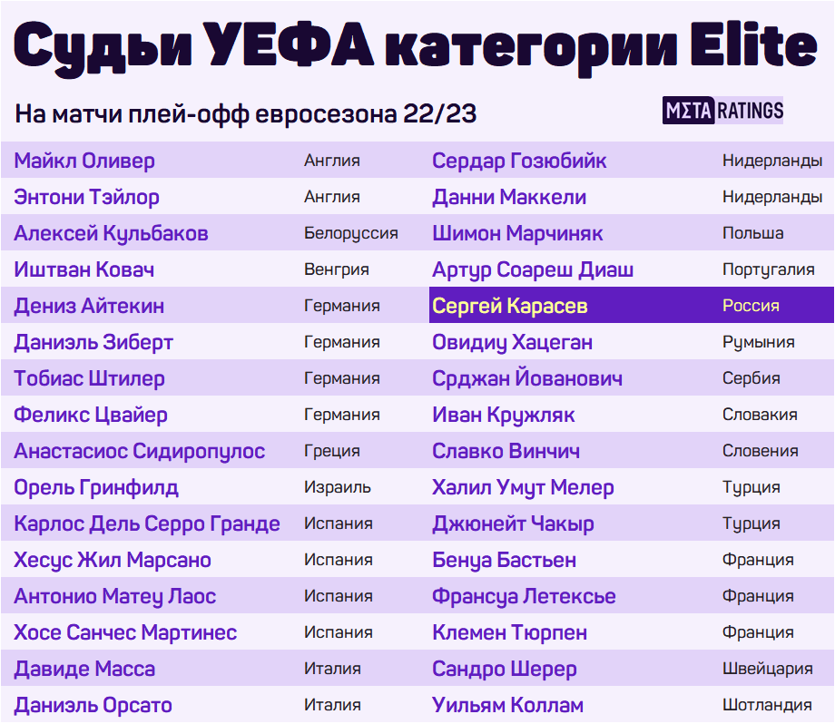 Лишь один российский судья входит в «элитную» категорию — Сергей Карасёв. По информации Metaratings.ru, за каждый проведенный матч УЕФА платит нашему лучшему арбитру по 5,5 тысяч евро. За 8 европейских матчей, в том числе за Суперкубок УЕФА и две игры в квалификации ЛЧ, Карасёв заработал 44 тысячи евро. По крайней мере, столько ему полагается.