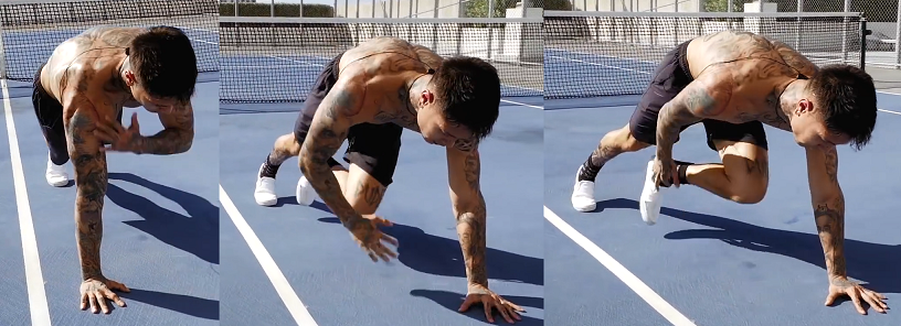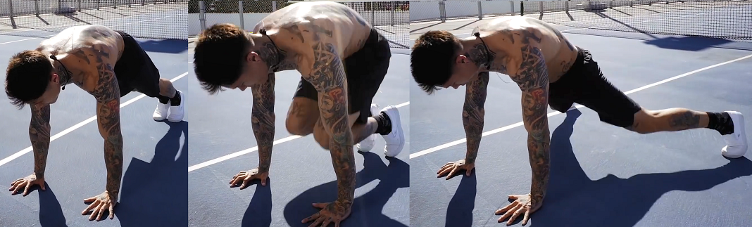 Примите упор лежа как при отжиманиях. Теперь поочередно выполняйте касание рукой противоположного плеча, затем – бока, потом – колена, в завершении – ступни. Это один полный повтор.