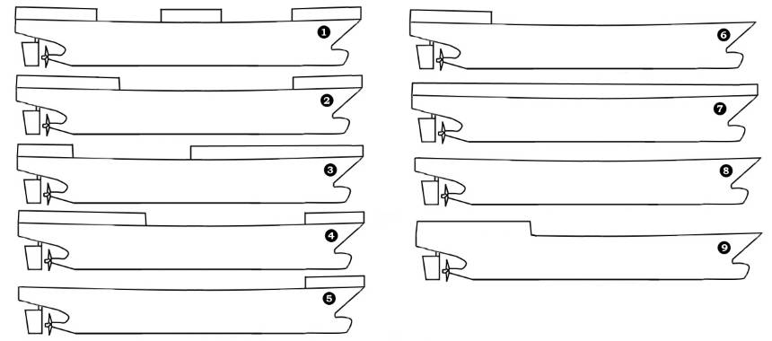 1 — трехостровное судно, 2 — двухостровное, 3 — двухостровное с удлиненным баком, 4 — двухостровное с удлиненным ютом, 5 — одноостровное с баком, 6 — одноостровное с ютом, 7 — со сплошной надстройкой (шельтердечное судно), 8 — гладкопалубное без надстроек, 9 — квартердечное
