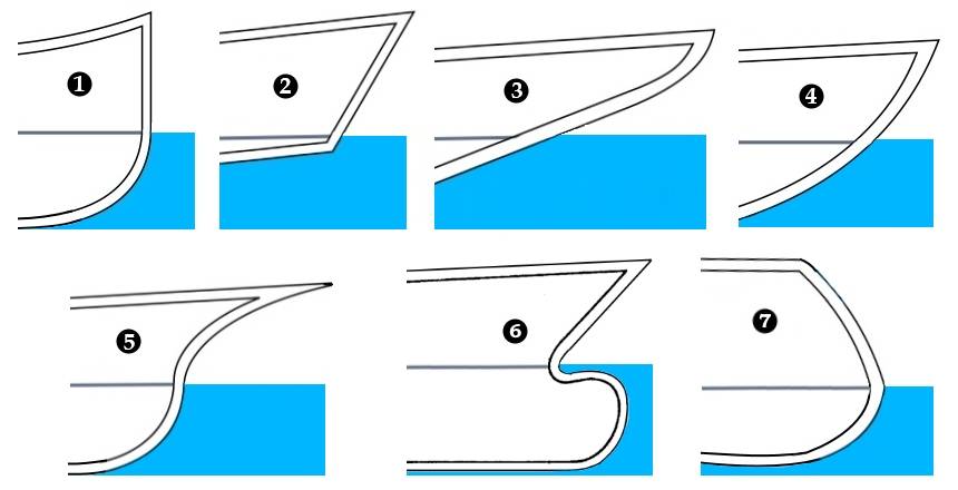 1 — нос транспортного судна с прямым наклонным форштевнем, 2 — нос судна ледового плавания, 3 — нос ледокола, 4 — ложкообразный нос рыбопромыслового судна, 5 — клиперский нос с бульбом, 6 — бульбообразный нос нефтеналивного танкера, 7 — нос типа X оффшорного судна
