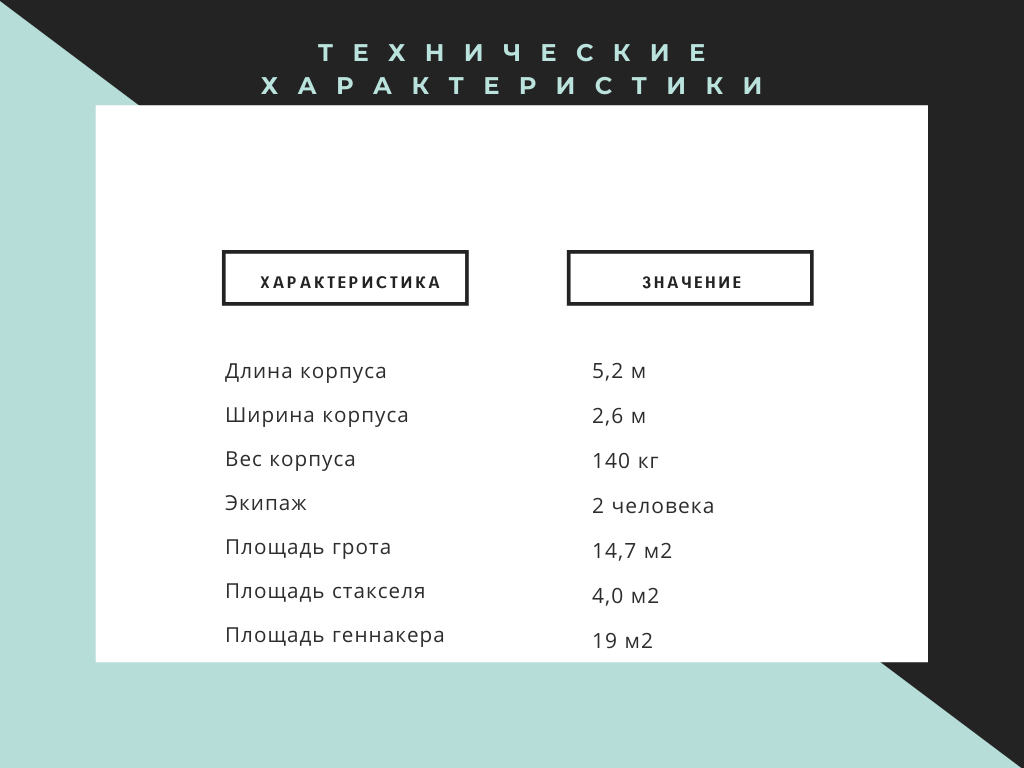 Особым нововведением данного класса гоночных яхт является состав экипажа, который обязательно должен состоять из мужчины и женщины. Они между собой сами распределяют роль рулевого и шкотового. Лодка устроена таким образом, что шверты изогнуты и являются своеобразными подводными крыльями. За счёт этого яхта поднимается и красиво мчит над поверхностью воды. Справиться с управление такого судна сможет только лишь опытный, слаженный экипаж.