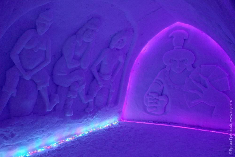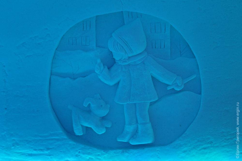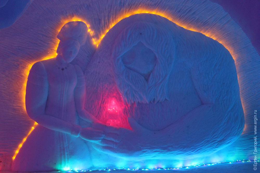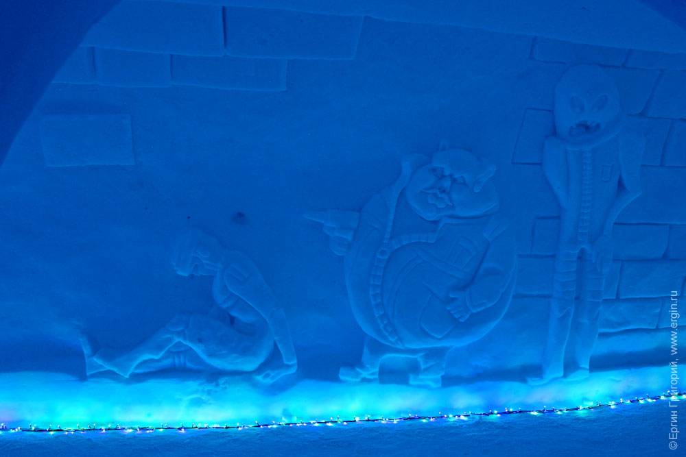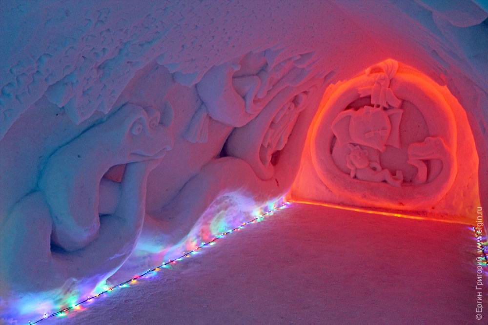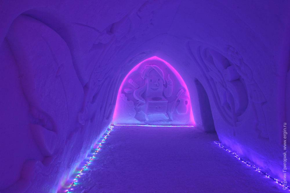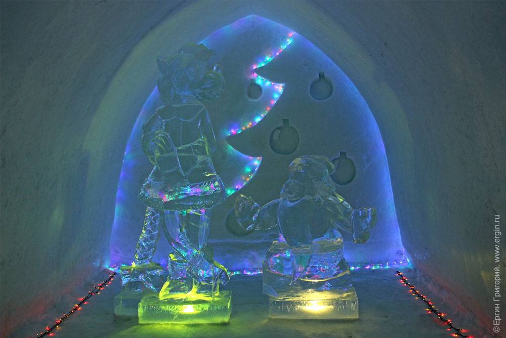 Не знаю, доживет ли сама деревня до этого времени, но внутри — свой микроклимат, как в пещере: ничего не тает, не течет. Все создано не любителями — специально приглашенными скульпторами. Подсветка всего этого великолепия осуществляется новогодними гирляндами. Вот тут очень интересно сделано: гирлянды под стеклом изо льда: