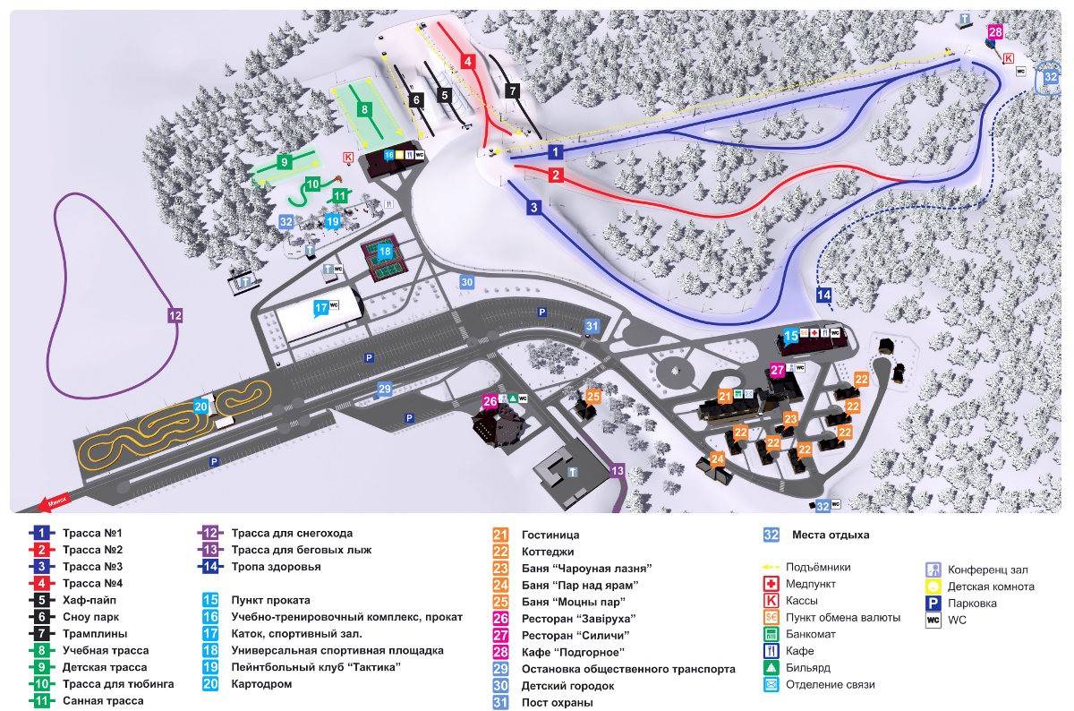 - 4 подъемника обслуживают основные 4 трассы и сноупарк, трамплины, учебную и детскую трассы: