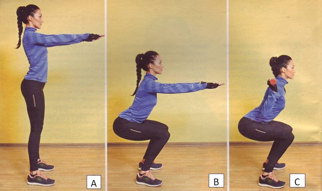 Второй важный момент: приседание должно осуществляться, будто сзади есть невидимый стул и надо на него сесть. Только при таком выполнении нагрузка будет распределена верно. Если упражнение выполнять правильно, то колени никогда не будут выходить за носки.