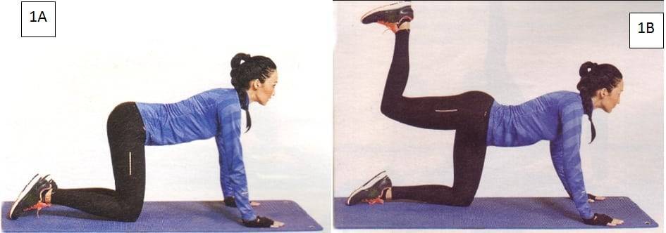 - Оставаясь на одном колене, поднимайте согнутую в колене под прямым углом противоположную ногу вверх так, чтобы включалась ягодичная мышца, но не перегружалась поясница.