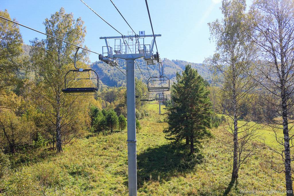 Когда мы подымались по канатной дороге, на вершину Синюхи ещё вёл старый кресельный подъёмник. Сейчас подъёмник всесезонного курорта «Манжерок» полностью реконструировали. Теперь на вершину бегают современные кабинки гондольного типа фирмы Doppelmayr. Такие же установлены на большинстве современных горнолыжных курортов России, например в Домбае и в Шерегеше на секторе Е. Мы же наслаждались видами на окрестности сидя на открытом воздухе.