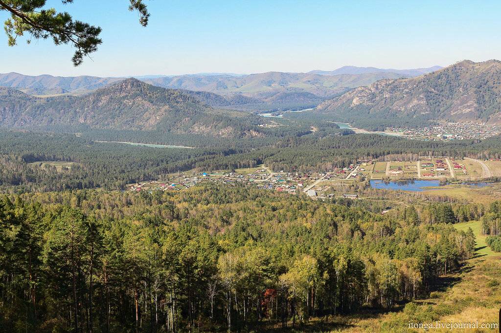 Здесь очень красиво. Внизу, голубой лентой между гор вьётся Катунь.