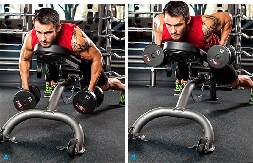 Для выполнения этого варианта достаточно сделать наклон 30 градусов, лечь на скамью животом, захватив гантели, и приводить их к поясу, одновременно стягивая лопатки к позвоночнику и сокращая мышцы спины. Бицепсы не должны вытягивать вес в одиночку, старт происходит за счет сведения лопаток и сокращения широчайших. В этом упражнении дополнительно работает еще и ромбовидная мышца, а вот трапециевидная выключается за счет упора и стабилизации.