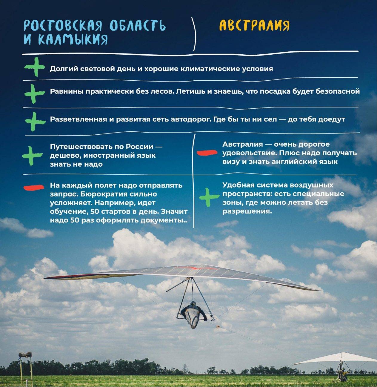 Россия — большая и мест для полетов на дельтаплане у нас много. Мои личные фавориты — Ростовская область и Калмыкия. Это рай для дельтапланеристов: необъятные просторы, можно ставить мировые рекорды один за другим. По условиям я называю эти регионы второй Австралией.