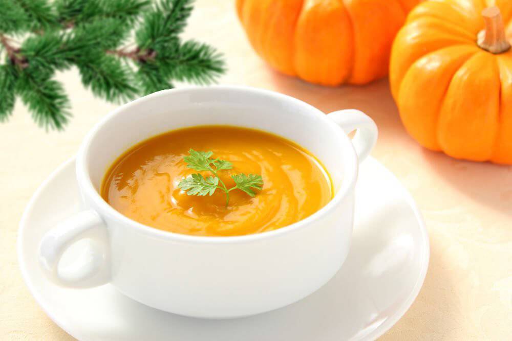 - Тыквенный суп-пюре – обжариваем в кастрюле лук, чеснок, морковь, добавляем кубики тыквы, заливаем бульоном (закрывая овощи примерно на сантиметр), тушим, добавляем специи, продолжаем тушить, затем измельчаем погружным блендером до однородной смеси.