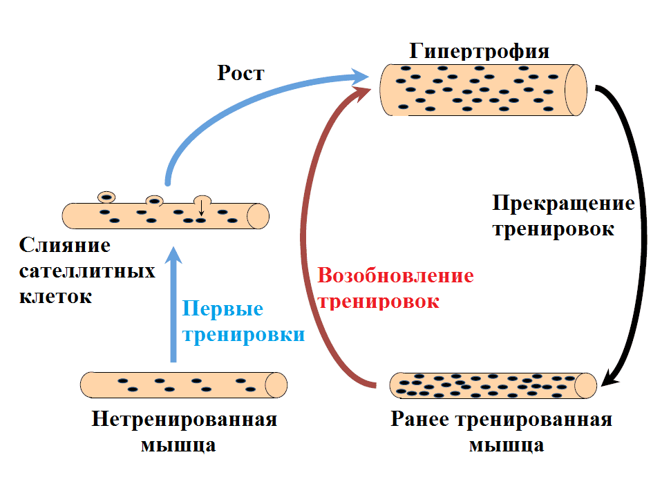 Когда тренировки с физическими нагрузками начинаются снова, то добавочные ядрышки возобновляют свою активную работу, что способствует синтезу белка и другим процессам. Культурист же, вернувшийся к занятиям, на каждой тренировке отмечает эффект. И эффект этот говорит о возвращении былой формы спортсмену.