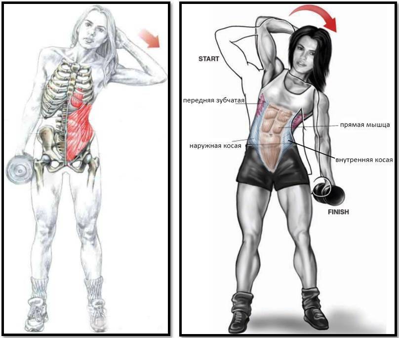 Анатомически, при наклоне тела вбок (как это изображено на рисунке) в работу включается передняя зубчатая мышца, наружная косая мышца, прямая мышца и внутренняя косая мышца. Все указанные мускулы располагаются в области живота, то есть под грудными мышцами