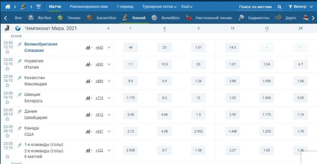 Выбирайте букмекерскую контору для ставок на хоккей так, чтобы в ней на рядовое событие было от 500 до 1000 рынков. Так вы получите возможность выбрать из множества вариантов нужный вам по коэффициенту и прогнозируемости.