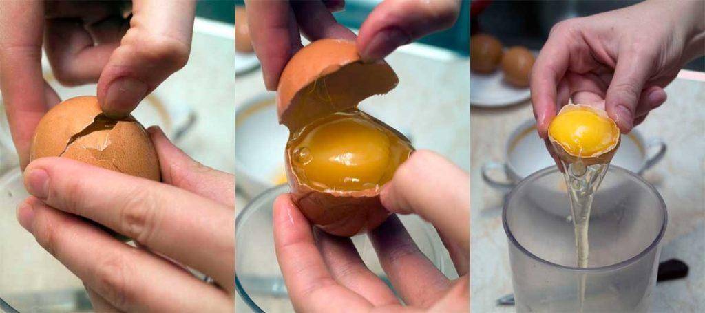 Нужно легонько стукнуть по скорлупе поперек и осторожно, двумя руками, не сдавливая ее пальцами, раскрыть, оставляя все внутренности яйца на одной стороне. Далее требуется аккуратно перемещать желток между половинками скорлупы так, чтобы белок стекал вниз