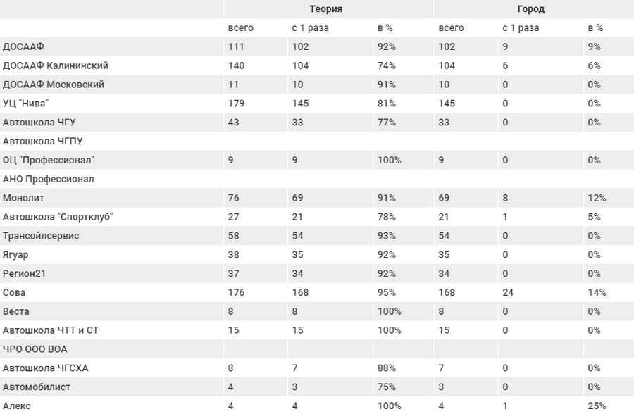 Еще недавно Госавтоинспекция публиковала на своем сайте отчеты под названием «Оценка результатов сдачи экзаменов кандидатов в водители…». В них приводились данные о количестве и процентах кандидатов на получение прав, которые сдают экзамены с первого раза в разрезе каждой автошколы. К сожалению, по приказу МВД с этого года Госавтоинспекция больше не публикует такую информацию. В нашем распоряжении есть отчеты за 9 месяцев прошлого и четыре месяца нынешнего года.