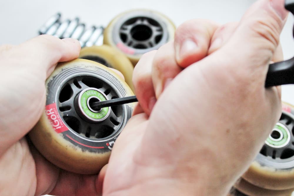 Так как же все-таки чистить подшипники? Внутри каждого колеса два подшипника и втулка. Сначала подшипники нужно извлечь из колеса. Для этого удобно использовать специальный ключ. Если ключа нет, можно использовать подручные средства, подходящие по размеру.