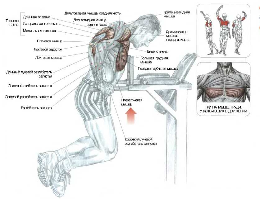 Какие мышцы включаются в работу во время отжиманий на брусьях