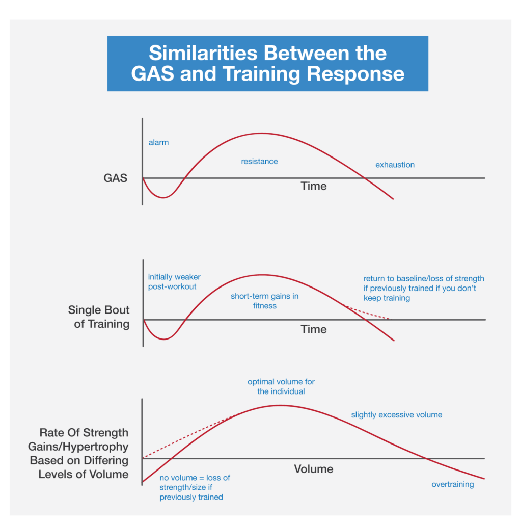 Схожесть ОАС и тренировочной периодизации. Верхний график: ОАС – снижение работоспособность, повышение и снова снижение. Средний график показывает аналогичную реакцию на однократную тренировку. Нижний – планомерые тренировки разного объема (при слишком большом объеме результаты падают из-за перетренированности).