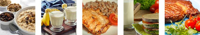 | 1-7 яичных белков, 1 желток, куриная грудка, кофе, джем. | Коктейль: 80 грамм углеводов и 50 грамм белков. | Бурый рис, курица/индейка. | Бурый рис, курица, рыба/индейка. | Бурый рис, курица, рыба/индейка. | 10 грамм белков, 3 тоста из цельнозерновой муки. |