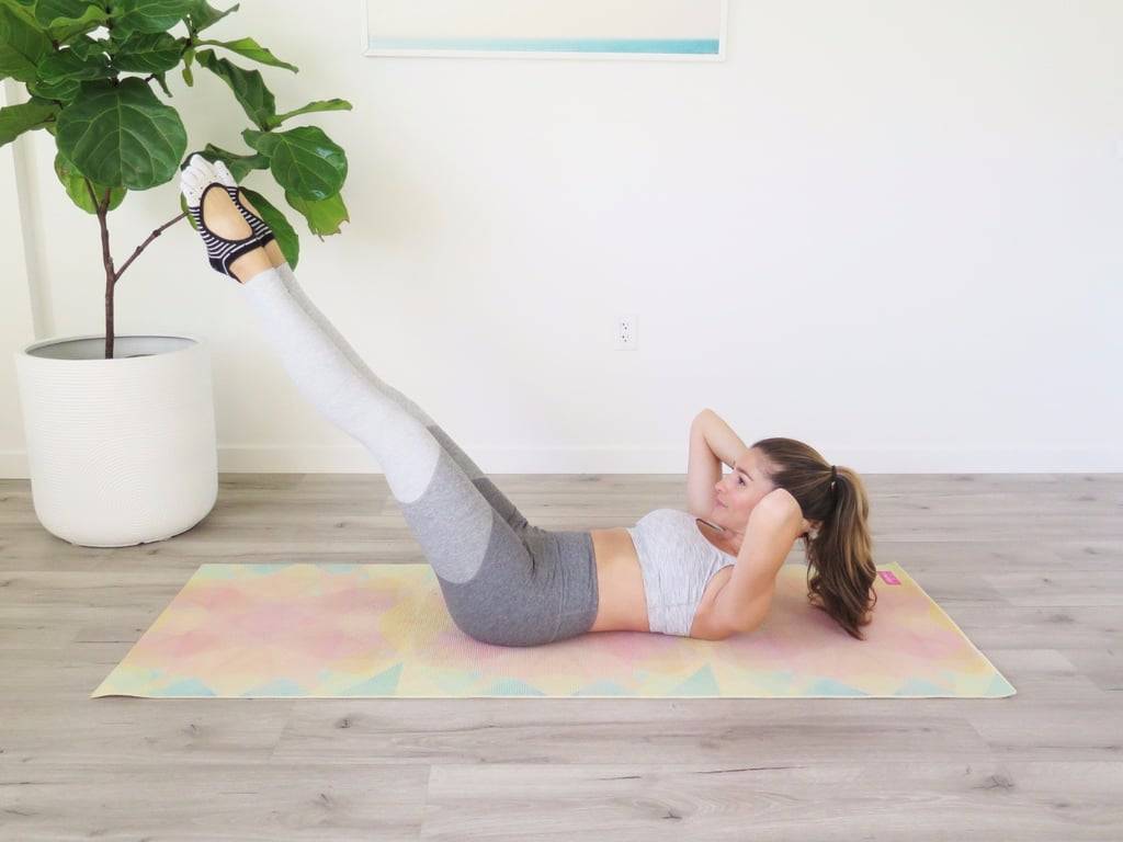 - V образные скручивания. В начале упражнения принять горизонтальное положение. После чего выполнять одновременный подъем прямых ног и вытянутых рук вверх до их соприкосновения. Это очень тяжелое упражнение, но оно идеально подходит для того, чтобы сделать кубики на животе.