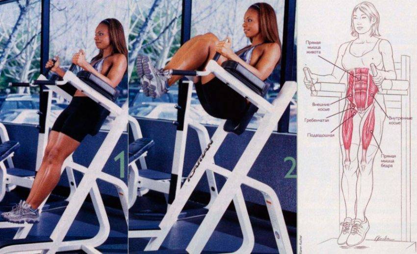 Упражнение делают, вися на турнике или перекладине. Во многих залах имеется тренажер в виде брусьев со спинкой. Есть три варианта исполнения: