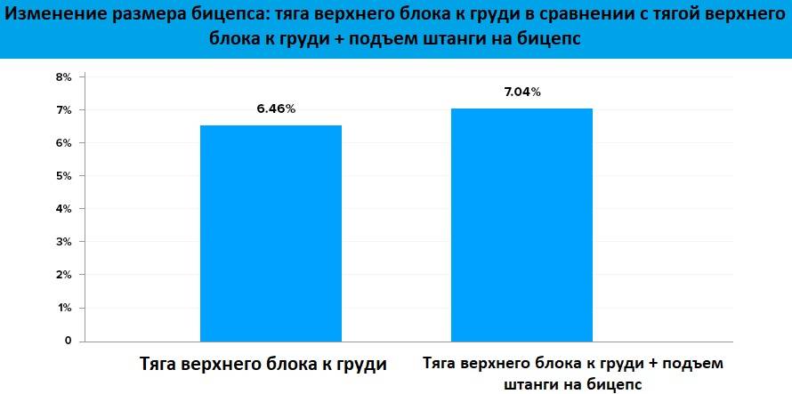 Это означало, что участники группы, выполнявшей тягу блока и подъем гантелей на бицепс, выполняли примерно в два раза больший объем работы (подходов и повторений), чем группа, выполнявшая только тягу верхнего блока