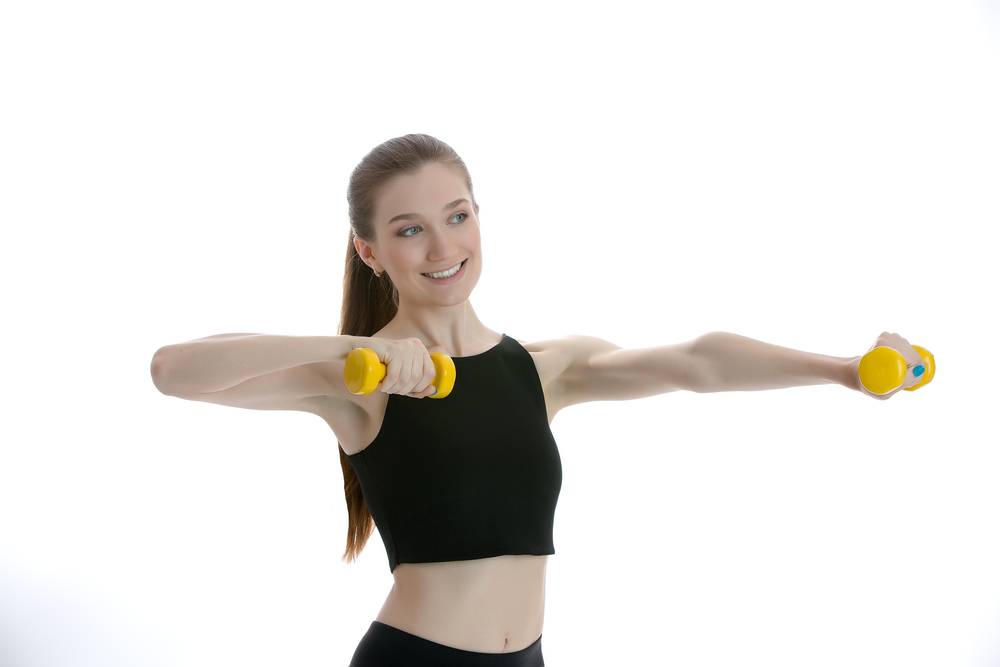 Первое упражнение проводится с гантелями. Требуется разводить руки в стороны. Для грамотного проведение стойте ровно, стопы соедините. Руки расслабьте и опустите вдоль тела. Ладони должны быть направлены в сторону ног. При выдохе руки поднимайте в сторону чуть выше линии плеч. Разрешается немного согнуть их в локте.