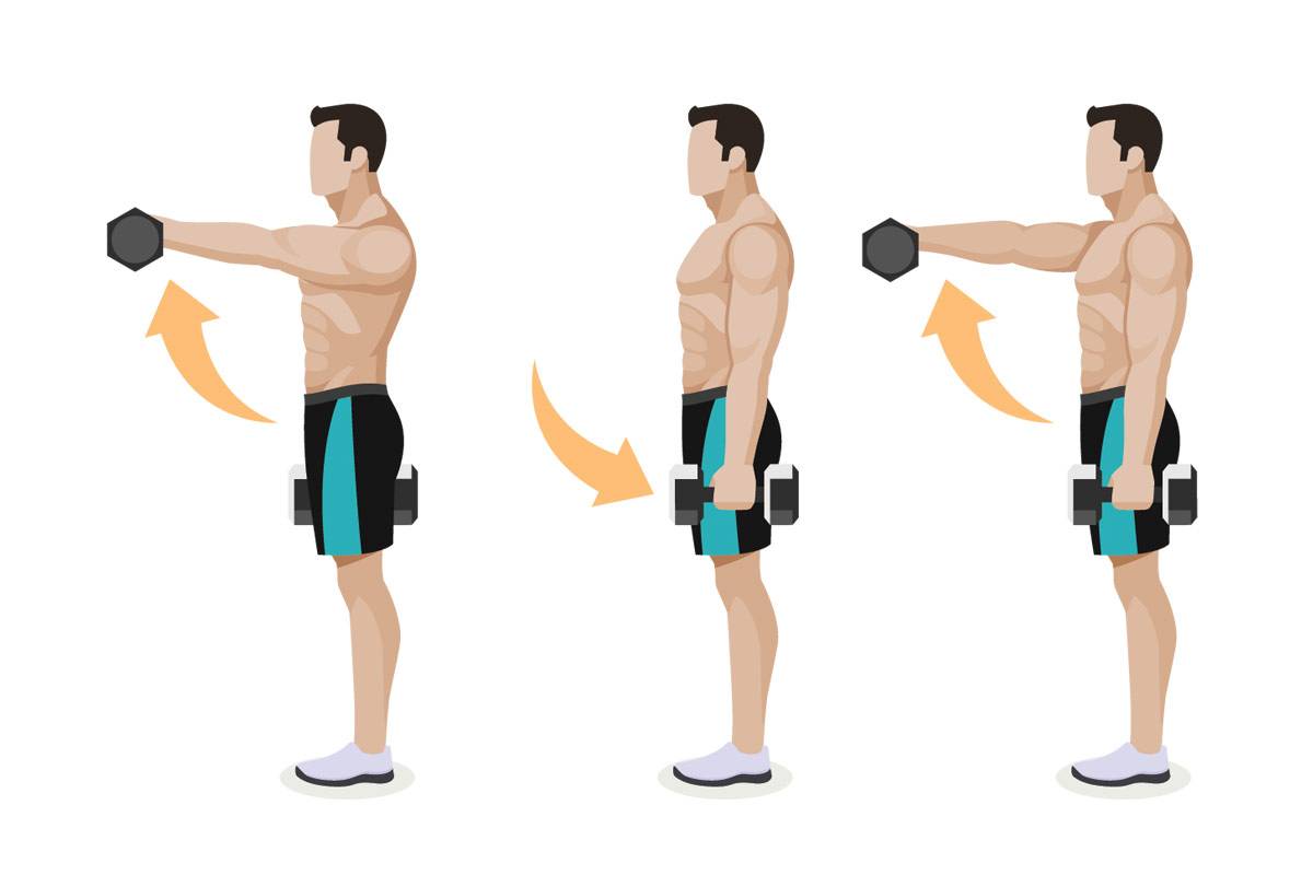 Упражнение для передней части дельтовидных мышц. Также используйте средний вес гантелей и следите за техникой. Начинайте поднимать руку только тогда, когда противоположная рука находится в нижней точке движения. 2-3 подхода по 12-15 повторений