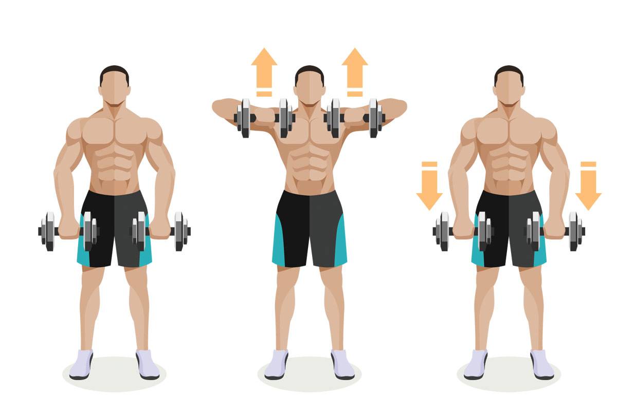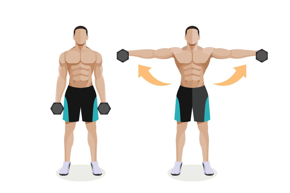 Упражнение для средней части дельтовидных мышц. При выполнении используйте средний вес гантелей и контролируйте неподвижное положение корпуса. Спина должна быть прямой, руки не должны сгибаться в локтях. Поднимайте вес до горизонтали. 2-3 подхода по 12-15 повторений
