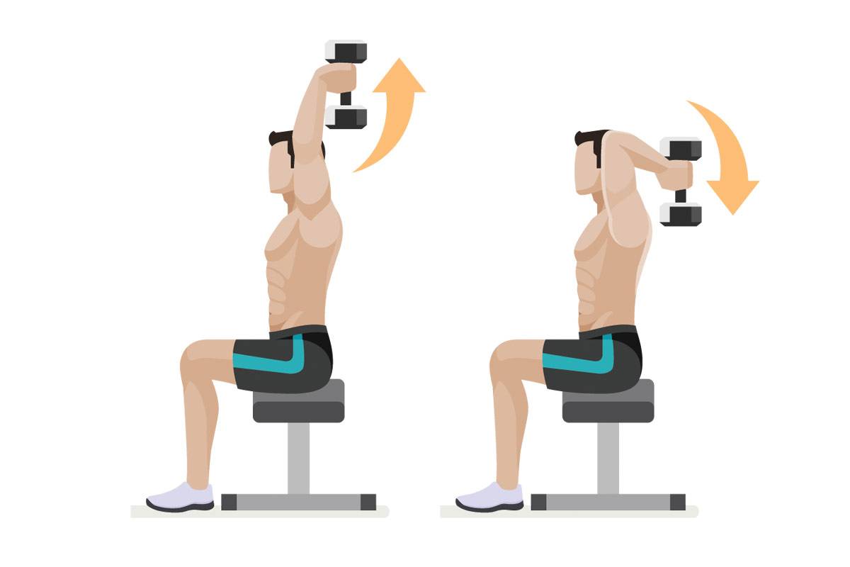 Упражнение для средней головки трицепса, придающее мышце объем. Может выполняться как с гантелей на скамье, так и в тренажере с веровкой (корпус при этом строго перпендикулярен полу). Совершайте медленные движения, в финальной точке движения напрягая трицепс еще сильнее. 2-3 подхода по 12-15 повторений