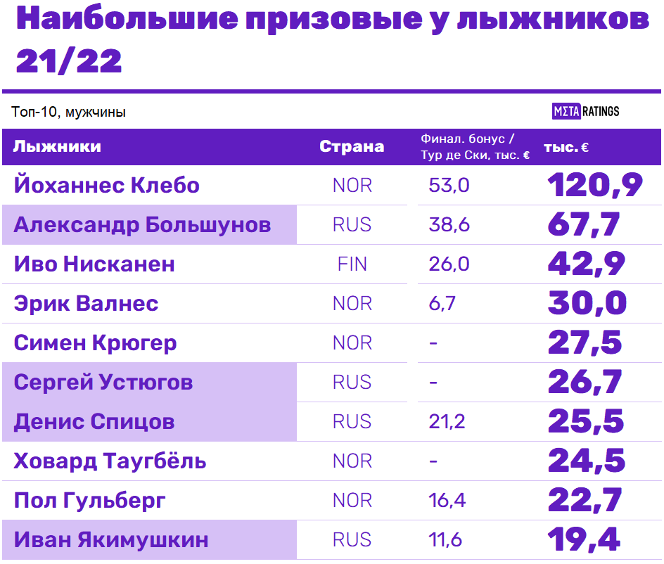 Сравнивая представителей разных видов спорта, стоит уточнить, что количество стартов везде разное, как и формат выплат. Например, FIS из-за опасений перед омикроном полностью вычеркнула из лыжного сезона Period III — старты во второй половине января между Тур де Ски и Олимпиадой. Здесь ведущие атлеты могли запросто добрать еще несколько десятков тысяч франков.
