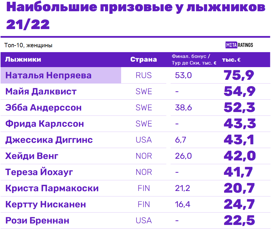 Лучшие среди россиян ожидаемо Александр Большунов и Наталья Непряева с 70,2 тысяч и 78,8 тысяч франков. Или 68 и 76 тысячами евро, соответственно – так удобнее сравнивать со спортсменами из других видов спорта. И да, в лыжах у нас случилась редкая ситуация, когда доходы женщин больше, чем у мужчин, но это касается лишь победительницы Тур де Ски-2021/22.
