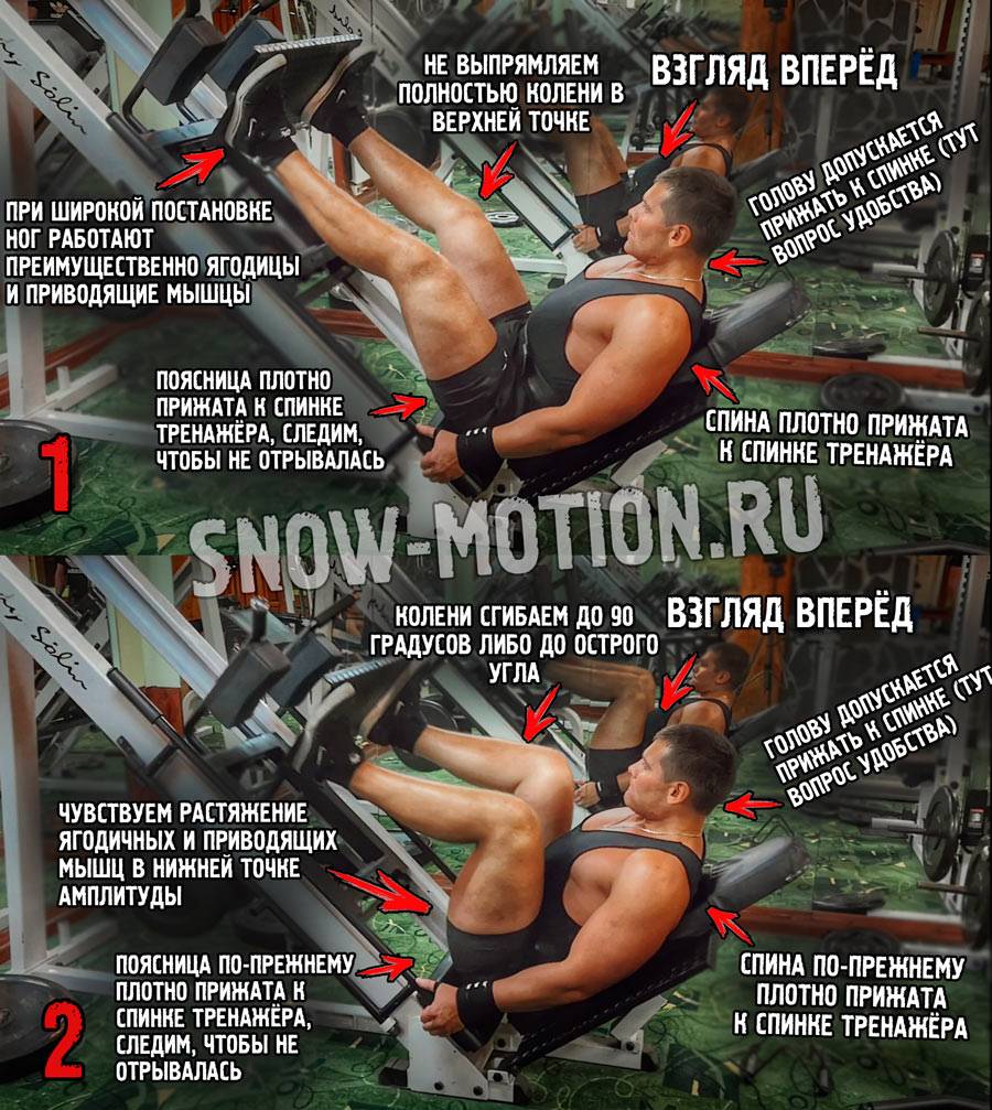 «Накиньте» на тренажер по обе стороны требуемый вес из блинов. Совет: всегда и во всех тренажерах используйте одинаковые блины, дабы нагрузка была одинаковой. Т.е. не нужно навешивать на жим ногами с одной стороны 10 кг одним блином, а с другой 2 по 5 кг. Примите исходное положение и расположите ноги на ширине плеч в середине платформы. Подожмите живот. Дышите грудью. Центр нажима переносим на пятки. Упершись в платформу, чуть подайте ее ногами вперед, снимая нагрузку со стопоров. Удерживайте платформу вверху. Ноги всегда должны плотно стоять на платформе, а пятки не должны отрываться от нее на протяжении всего сета. Крепко держитесь руками за поручни – так легче сохранить устойчивое положение тела. Медленно опустите “тележку” вниз до угла 90 градусов в коленном суставе. Выполняем опускание на вдохе. Это негативная фаза. При этом в нижней точке угол сгибания в коленном суставе не должен быть меньше 90°. Ваши колени не должны упираться в грудь. Не стоит опускать платформу ниже – это заставит поясницу оторваться от спинки и принять нагрузку, рискуя травмироваться. Следите, чтобы поясница всегда была плотно прижата к скамье. Совет: тратьте на негативную фазу около 3 секунд. Считайте про себя или вслух 1-2-3, опуская вес. Суть в медленном негативном движении и мощном позитивном. На опускание вы будете тратить 3 секунды, а бедра будут налиты кровью и кряхтеть от пресыщения работой, но поверьте – это хороший стресс для дальнейшей адаптации организма. Распрямите колени, толкая вес пятками, затем верните платформу в исходное положение. Делаем на выдохе. Это позитивная фаза. Она должна быть мощной, быстрой и уверенной, но при этом очень плавной. При движении из нижней точки исключите рывки тела или головы
