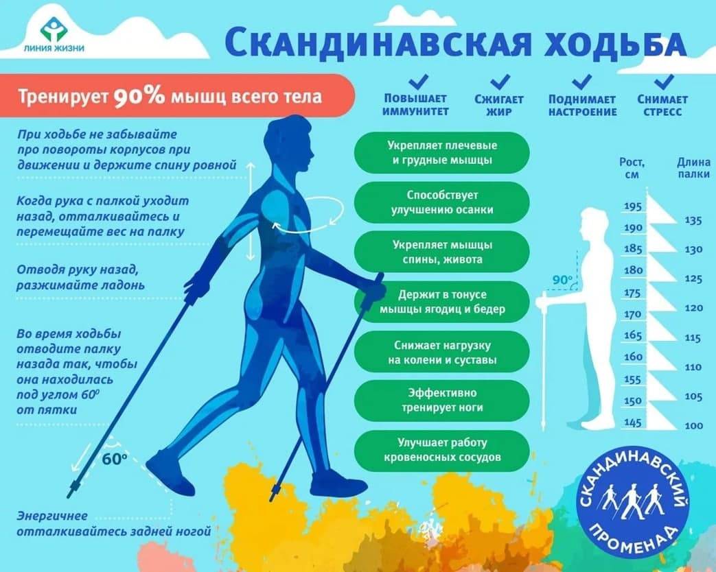 Прогулка обычным шагом задействует около 70% мышц всего тела, а скандинавская ходьба – до 90%. Калории сжигаются тоже интенсивнее – на 20–40% больше, чем при обычной ходьбе. При совмещении техники скандинавской ходьбы с привычной скоростью передвижения тренировка усложняется без лишних усилий. Увеличивается объем легких и частота сердечных сокращений, а значит, скандинавская ходьба выигрывает у обычной и в плане профилактики сердечно-сосудистых и легочных заболеваний