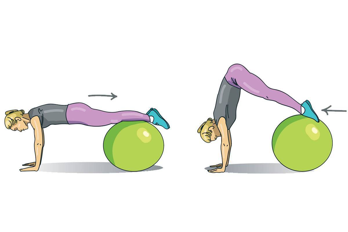 - Распрямите руки, и удерживайте вес на мышцах брюшного пресса и руках. Подтяните ноги с мячом к себе, сгибая бедра и колени, и после короткой паузы верните ноги в исходное прямое положение.