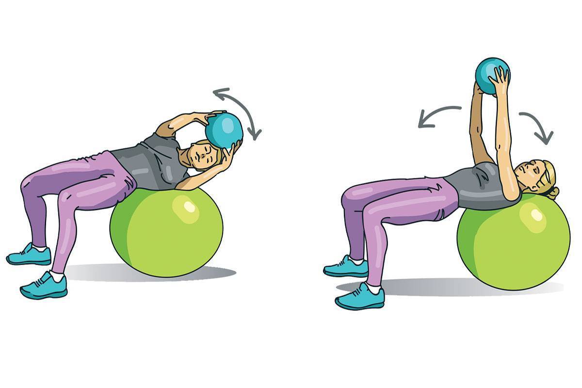 Исходное положение – лежа верхней частью спины на фитболе, правая нога согнута в колене и стоит на полу, левая вытянута вперед. Правая рука также вытянута, а левая — внизу. На выдохе поднимите левую ногу вверх, одновременно направляя правую руку к колену. Следите за ощущением работы бокового пресса.