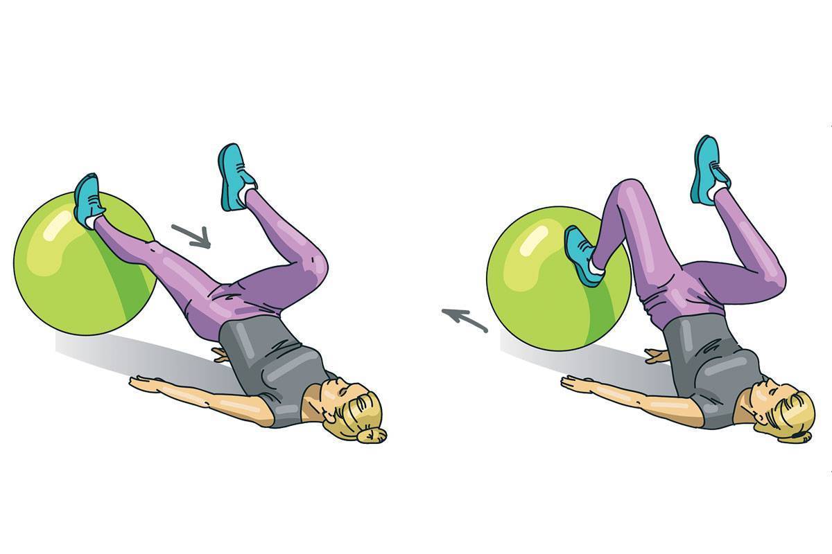 Исходное положение — лежа на спине на полу, руки вытянуты вдоль тела, одна нога на фитболе, другая согнута в колене и поднята вверх. За счет активации мышц пресса и ягодиц медленно подкатите мяч к себе, затем вернитесь в исходное положение и перемените ногу.
