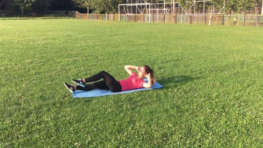 Исходное положение: лежа на спине, ноги согнуты в коленях и плотно стоят на полу. За счет активации абдоминальных мышц плавно поднимите плечи на 10-15 см, округляя спину и скручиваясь по направлению к коленям. Задержитесь на 1-2 сек, затем медленно опустите корпус, однако не касайтесь плечами пола.