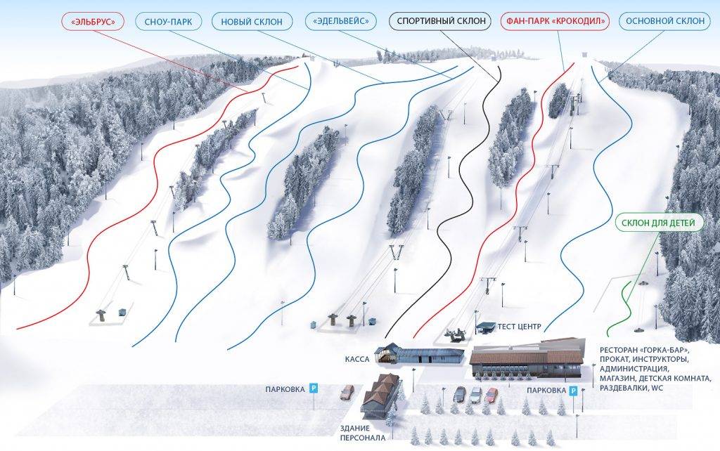 Курорт имеет сертификат FIS (Международной федерации горных лыж). Склоны достигают в длину 900 метров. Всего их семь, включая склон для детей, спортивный склон и фан-парк «Крокодил». В распоряжении отдыхающих прокат инвентаря, уроки инструктора, мощная подсветка. Катания продолжаются до 23:00. В последние годы возрос интерес к тимбилдингу — корпоративным играм, направленным на сплочение коллектива. Здесь можно получить мощный эмоциональный заряд для всей команды и отлично провести время.