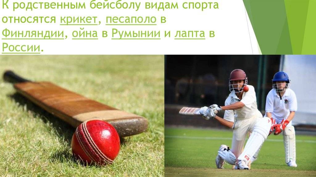 К родственным бейсболу видам спорта относятся крикет, песаполо в Финляндии, ойна в Румынии и лапта в России.