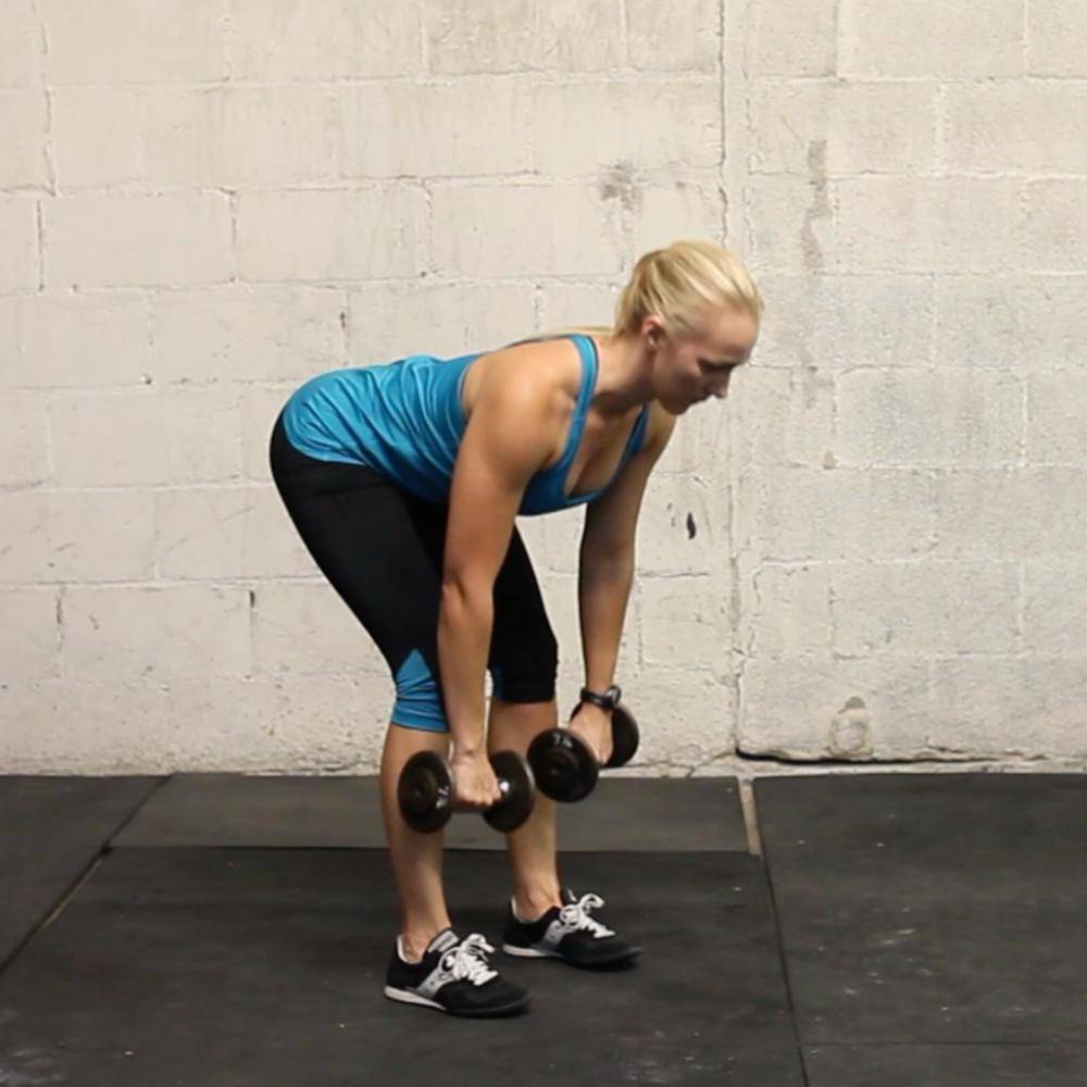 - Исходное положение – внизу, с гантелями по обеим сторонам от тела, с напряженными ногами, «вставленной» напряженной спиной и сведенными лопатками;