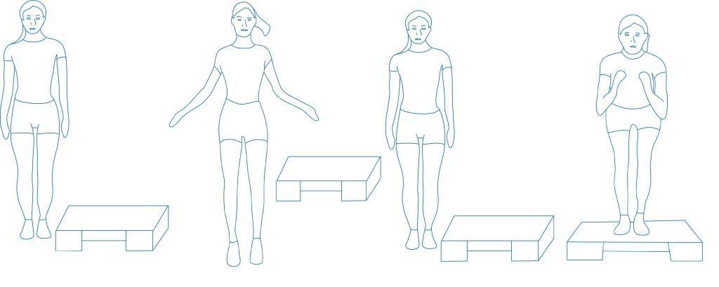 - Шагните вперед, прыгните двумя ногами, затем вернитесь назад к платформе.