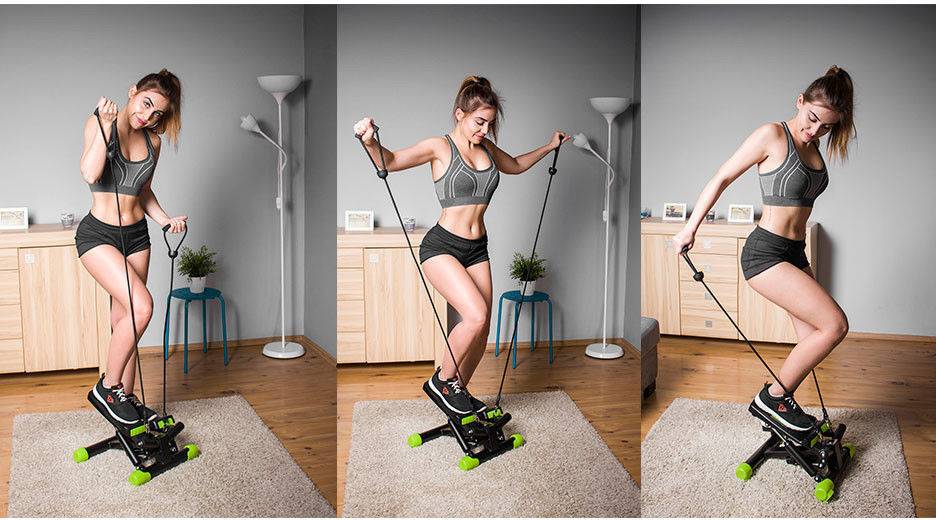 Мини степпер отлично укрепляет ягодицы и зону ног, способствует похудению в области бёдер. Стандартная модель с поручнями работает ещё эффективнее, так как она задействует всё тело сразу.