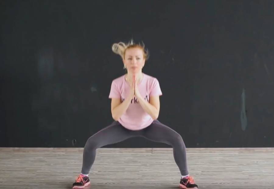 Подпрыгнув, расставьте ноги шире и присядьте чуть глубже, располагая бедра параллельно с полом, а колени в том же направлении, что и ступни.