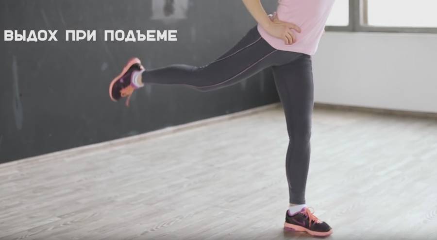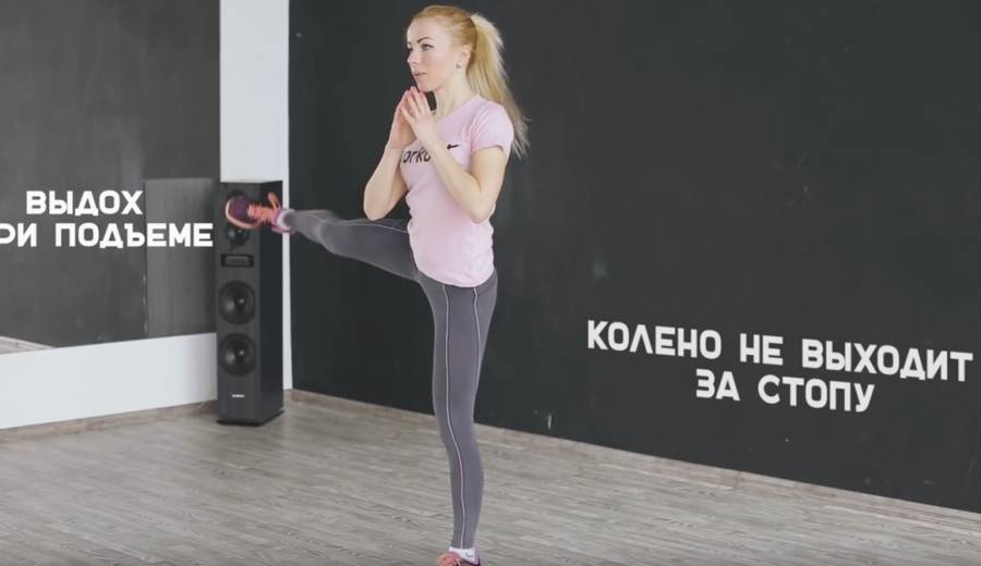 - Поднимаем ногу вперед, тянем ее высоко.